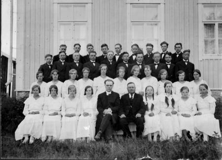 Fotografiet tillhört konfirmanden Hjördis Elenius, f. 1916. Hjördis dog fem år senare i lungsot. Hjördis är 2. från vänster, på samma rad som kyrkoherden.