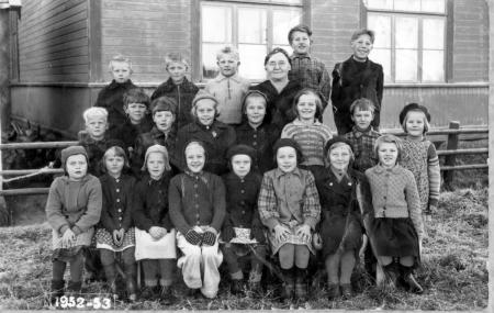 Småskolan vid Mietala år 1952. Bilden lånats av John Elenius för skanning. Lärare Ingeborg Åkerholm, som var lärare där under åren 1922-1956.